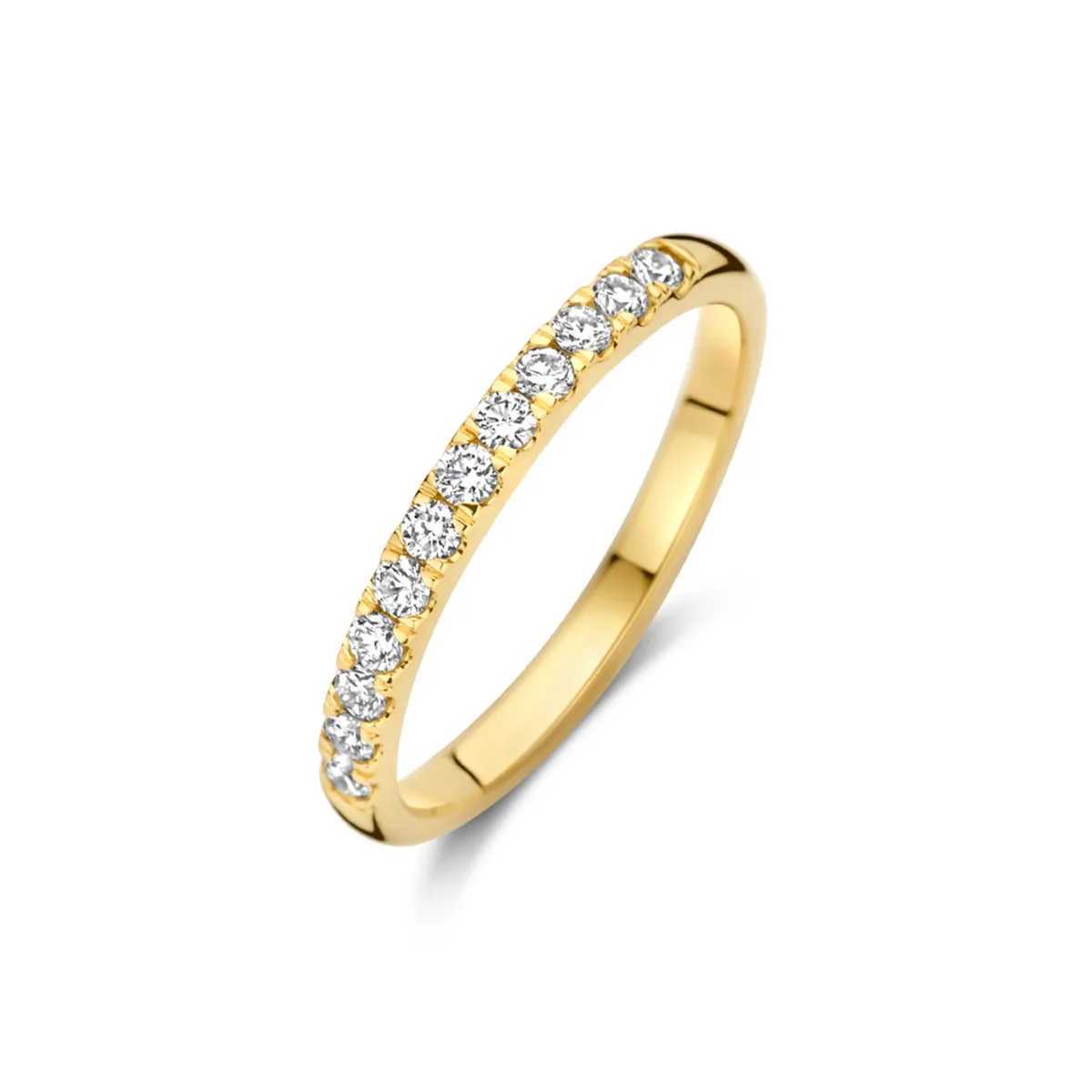 Deze 14k geelgouden ring is bezet met negen briljant geslepen lab grown diamanten van elk ⌀ 2,8 mm, samen goed voor 0,72 ct, gezet in een verfijnde pavé zetting op een slanke band van 1,7 mm. Lab grown diamanten hebben dezelfde schittering en kwaliteit als natuurlijke diamanten en zijn een bewuste keuze. De rij fonkelende stenen vangt het licht bij elke beweging en geeft je look een frisse, eigentijdse glow.