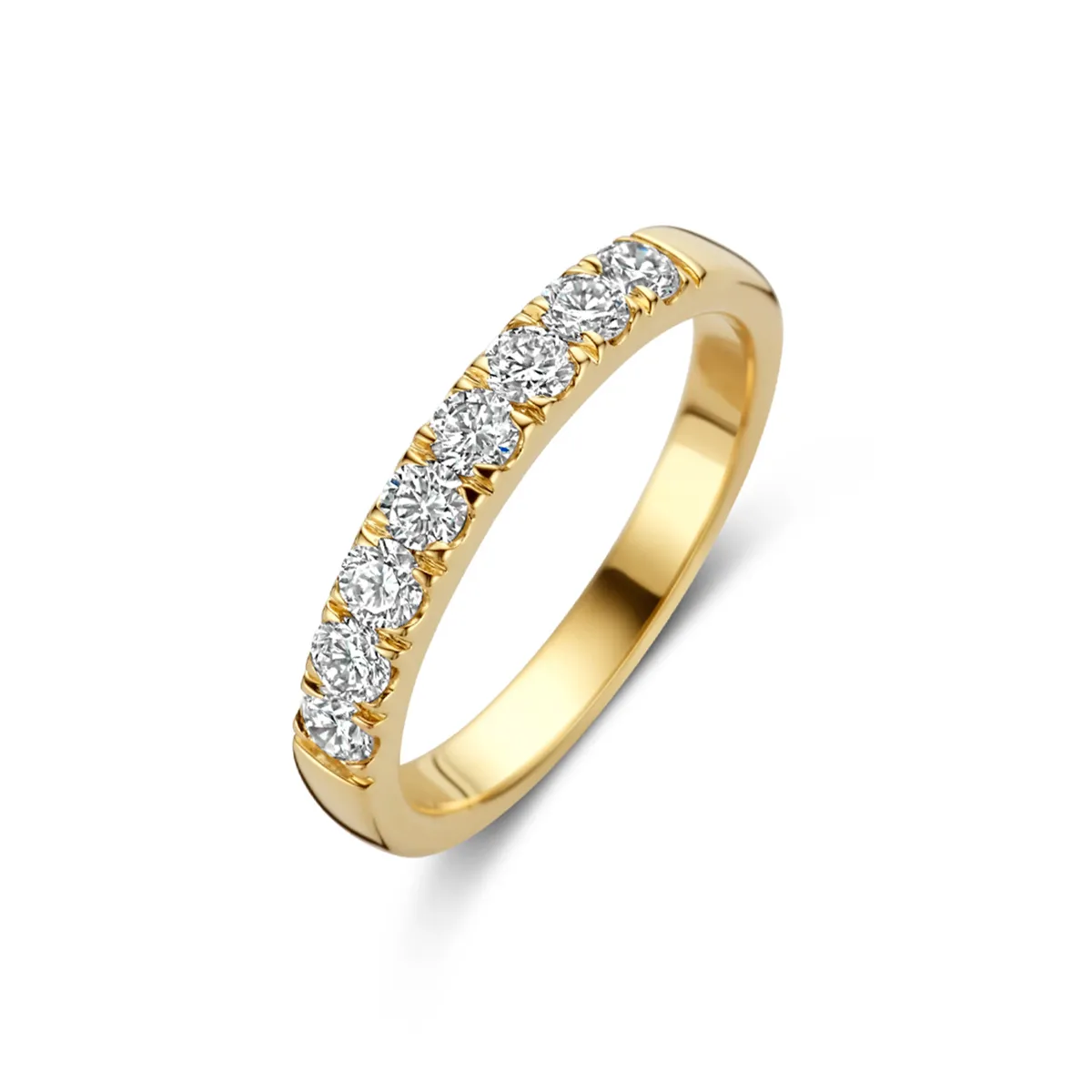 Deze 14k geelgouden ring is vervaardigd van gecertificeerd gerecycled goud en bezet met acht briljant geslepen lab grown diamanten in een pavé zetting, samen goed voor 0,56 ct. Lab grown diamanten hebben dezelfde schittering en kwaliteit als natuurlijke diamanten en zijn een bewuste keuze. De slanke band van 3 mm geeft de ring een elegante basis, terwijl de rij fonkelende stenen zorgt voor een subtiele maar opvallende sparkle, perfect om solo te dragen of te combineren.