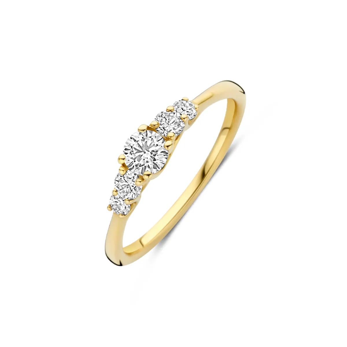 Deze 14k geelgouden ring is gezet met vijf briljant geslepen lab grown diamanten, met een middensteen van 0,30 ct, twee zijstenen van elk 0,10 ct en twee kleinere accenten van 0,05 ct, in een verfijnde chaton zetting. Het ontwerp is een eigentijdse interpretatie van de klassieke three stone ring, waarin verleden, heden en toekomst samenkomen, aangevuld met extra sprankeling. Lab grown diamanten hebben dezelfde schittering en kwaliteit als natuurlijke diamanten en zijn een bewuste keuze. De gelaagde opbouw van stenen geeft de ring een rijke, elegante uitstraling met een zachte, vrouwelijke flow.