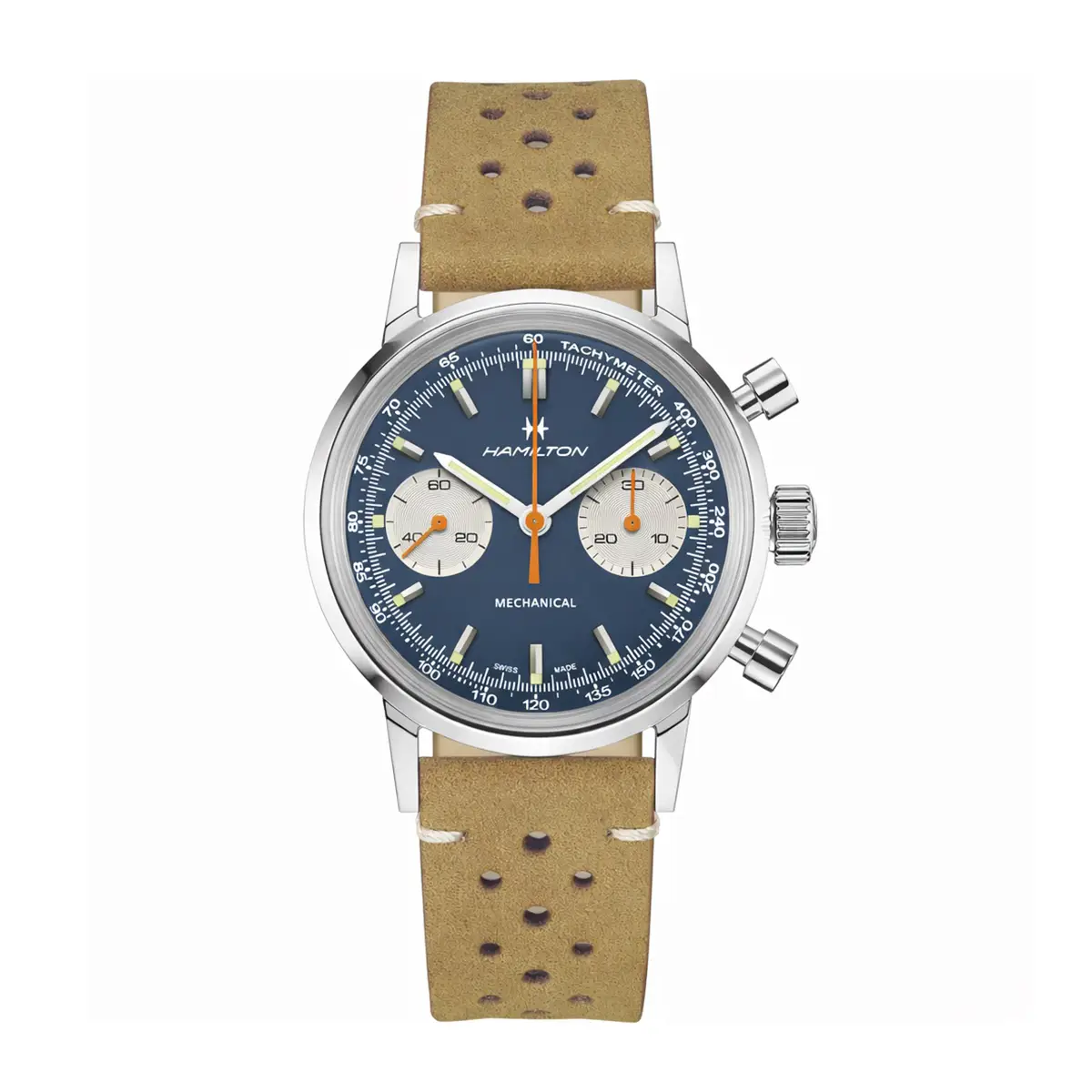 De 40 mm edelstalen kast omlijst een diepblauwe wijzerplaat met sportieve oranje accenten voor extra sportiviteit. Binnenin tikt het H-51 mechanische chronograafuurwerk: handopwindbaar, zonder rotor of datumvenster, met een verlengde gangreserve van 60 uur. Start-, stop- en resetdrukknoppen maken het bedienen van de chronograaf heerlijk direct en tastbaar. Het horloge wordt geleverd met zowel een lederen band als een edelstalen meshband en is waterbestendig tot 10 bar.