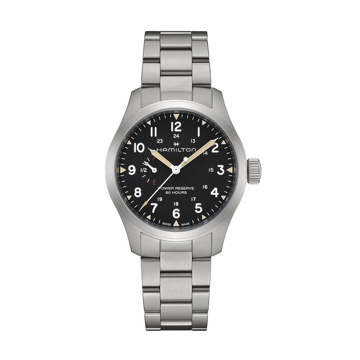 De Hamilton Khaki Field Mechanical Power Reserve 40mm brengt de militaire roots van de collectie tot leven met een modern tintje. Dit model is volledig uitgevoerd in edelstaal en voorzien van een zwarte wijzerplaat, waarbij de 3-rijige band naadloos overloopt in de kast voor een krachtige en strakke uitstraling. Binnenin tikt het exclusieve H-23 handopwind-uurwerk, dat tot 80 uur gangreserve biedt – voor het eerst zichtbaar op de wijzerplaat dankzij de duidelijke power reserve-indicator. De robuuste edelstalen kast met krasbestendig saffierglas en waterbestendigheid tot 100 meter maakt dit horloge betrouwbaar in elke situatie.