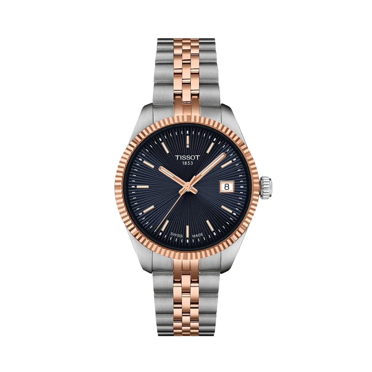 Met de Ballade-collectie toont Tissot hoe klassiek Zwitsers design zich moeiteloos laat vertalen naar een meer verfijnd, eigentijds silhouet. Dit 34 mm model is de charmante zus van de grotere herenuitvoering, met dezelfde uitgebalanceerde mix van 316L-edelstaal en roségouden PVD-accenten. De warme gloed van de geribbelde bezel en de middenrij van de band vormt een zacht contrast met het koelere edelstaal.