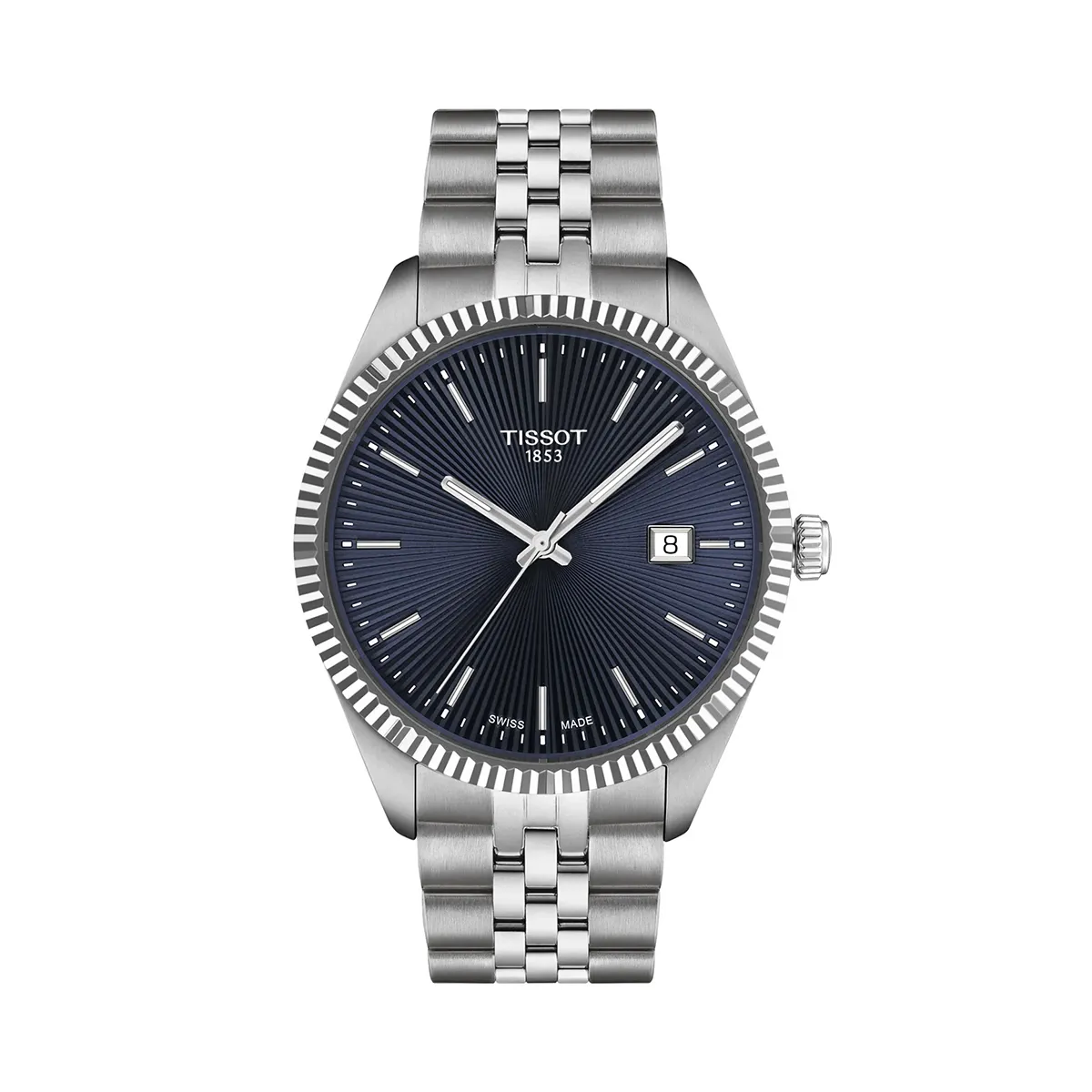 Dit 40 mm herenmodel is uitgevoerd in 316L-edelstaal en wordt aangedreven door een betrouwbaar Zwitsers kwartsuurwerk. Achter het krasbestendige, ontspiegelde saffierglas ligt een diepblauwe wijzerplaat met een uitgesproken stralend patroon dat afhankelijk van het licht van inktblauw naar staalblauw verschuift. De signatuur Tissot 1853 verwijst naar het oprichtingsjaar van het merk en benadrukt zijn lange traditie van vakmanschap. Slanke indexen en een discreet datumvenster op 3 uur houden het geheel overzichtelijk. De 5-rijige schakelarmband, uitgevoerd in afwisselend glanzend en gematteerd edelstaal, biedt soepel draagcomfort.