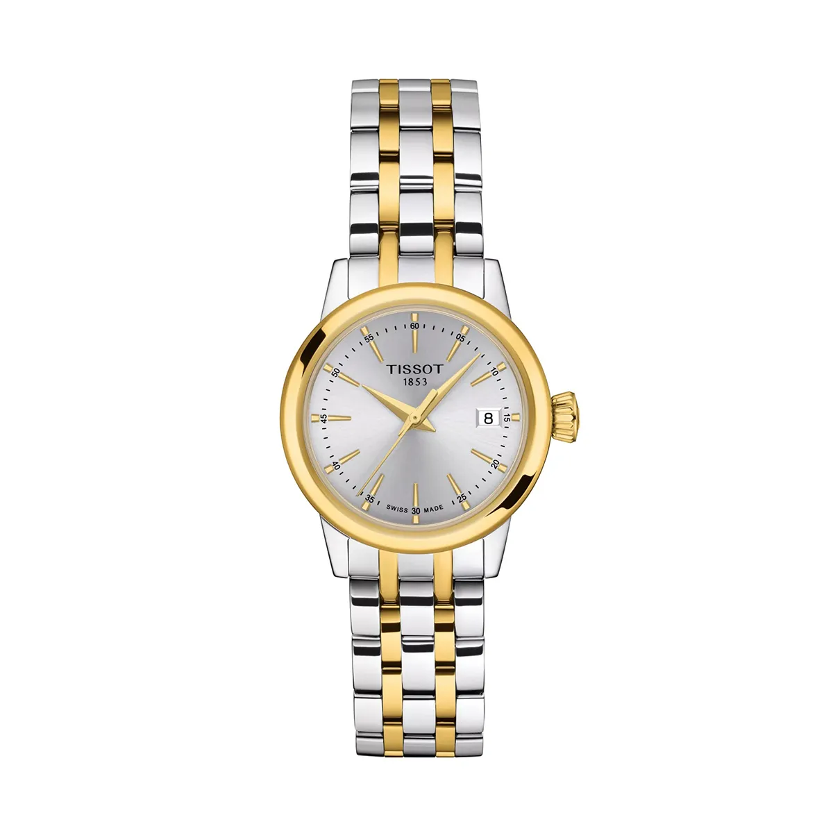 Met de Classic Dream-lijn brengt Tissot tijdloze verfijning terug tot een sierlijk, compact formaat. Deze 28 mm uitvoering speelt met contrasten: de gepolijste edelstalen kast krijgt extra warmte door de goudkleurige PVD-bezel en kroon, terwijl de twee-kleurige 5-rijige band het geheel een subtiele luxe uitstraling geeft.