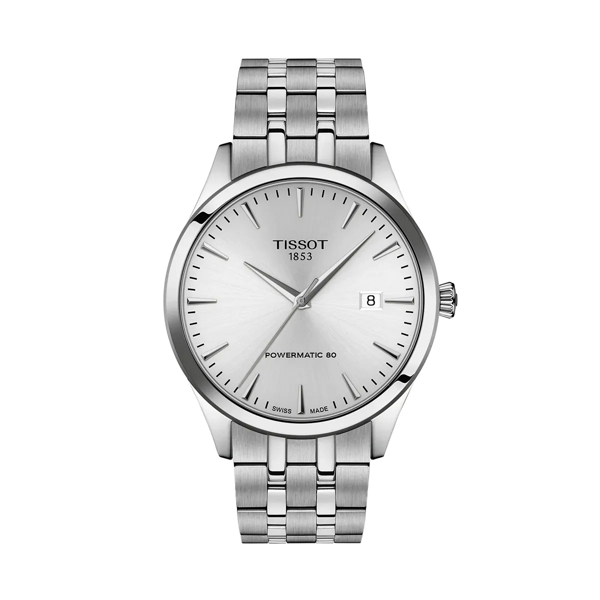 De zilverkleurige wijzerplaat heeft een verfijnd sunray-effect dat bij elke beweging een nieuwe lichtval toont. Het subtiele datumvenster op 3 uur houdt de symmetrie intact, terwijl de aanduiding Powermatic 80 op de wijzerplaat trots verwijst naar het automatische uurwerk binnenin — een betrouwbare machine met tot 80 uur gangreserve.