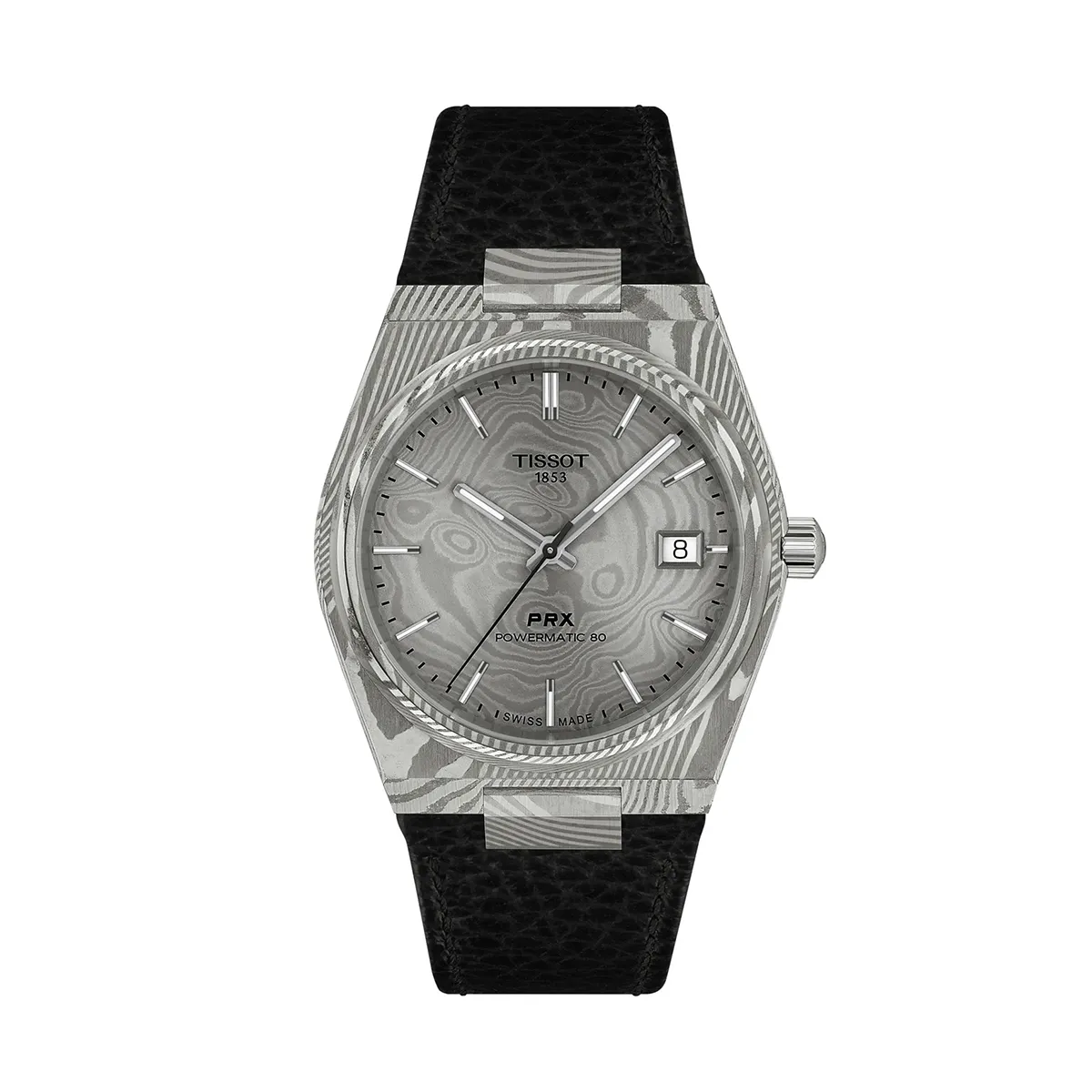 Dit 38 mm model is uitgevoerd in gemarmerd edelstalen damaststaal, waarbij het organische patroon per exemplaar subtiel anders uitvalt, precies zoals het materiaal bedoeld is. De fijn getextureerde wijzerplaat en het karaktervolle oppervlak geven de PRX een uitstraling die generaties overspant en erfgoed moeiteloos met moderniteit verweeft. Achter het krasbestendige, ontspiegelde saffierglas ligt een automatische Powermatic-motor met 80 uur gangreserve, zichtbaar via het transparant kastdeksel.