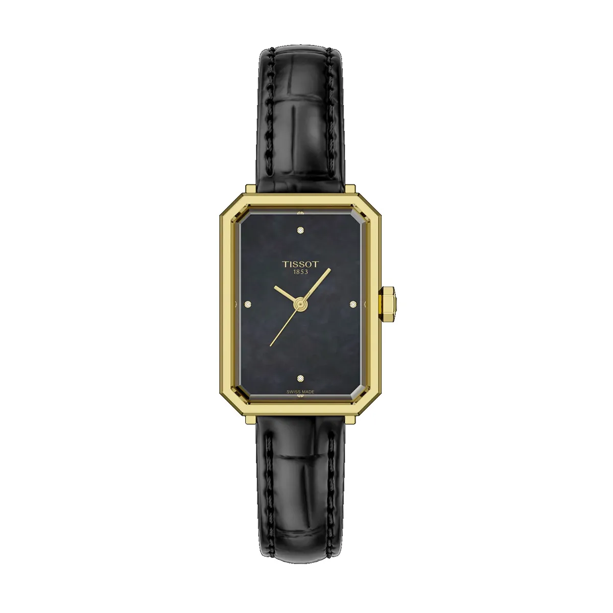 Dit model uit de Tissot SRV 30 mm collectie weet klassieke allure te combineren met een moderne uitstraling. De rechthoekige kast in geelgoud PVD op edelstaal vormt een luxueus contrast met de zwarte parelmoer wijzerplaat, die afhankelijk van het licht een subtiel iriserend effect laat zien. Minimalistische indexen en slanke goudkleurige wijzers zorgen voor een ingetogen, stijlvolle uitstraling.