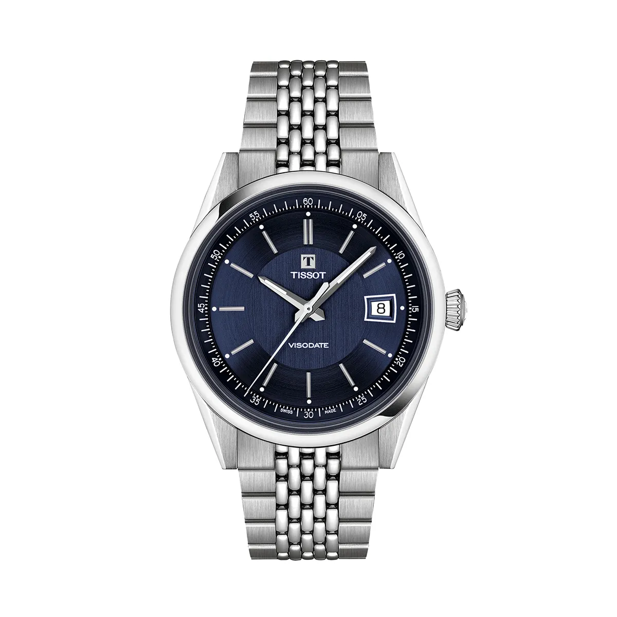 Visodate is onderdeel van de Classic Traditional lijn, geïnspireerd op de elegantie van de jaren ’50. Deze uitvoering met blauwe wijzerplaat geeft het horloge een frisse, iets modernere uitstraling binnen het klassieke ontwerp. De wijzerplaat is afgewerkt met een verfijnde sunburst slijping. De slanke indexen, dauphine wijzers met lichte luminescentie en de minutenschaal langs de rand zorgen voor een heldere, goed gestructureerde opbouw. Het omlijnde datumvenster op 3 uur voegt een herkenbaar en functioneel detail toe.
